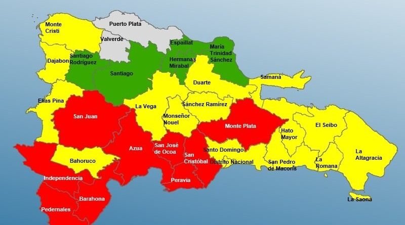 En aviso amarillo se encuentran ahora: La Vega, Samaná, Hato Mayor, El Seibo, Elías Piña, Duarte, Bahoruco, Monseñor Nouel, Sánchez Ramírez, Montecristi, Dajabón, La Altagracia; a los que se suman el Distrito Nacional, Santo Domingo, La Romana y San Pedro de Macorís.